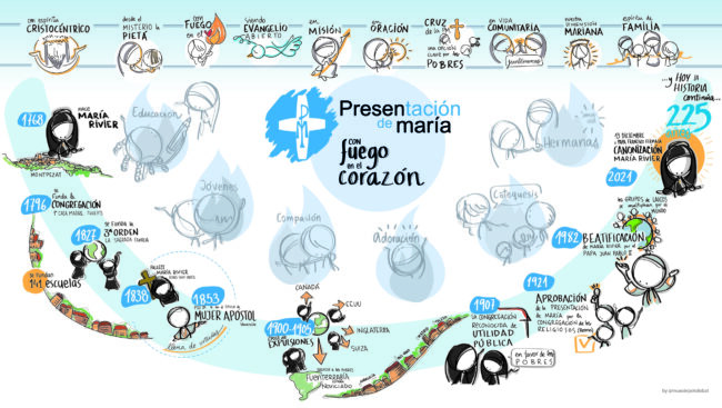 Queremos felicitaros el día de nuestra Fundadora María Rivier con una infografía que representa la línea del tiempo de nuestra Congregación PRESENTACIÓN DE MARÍA. Tiene 3 partes: